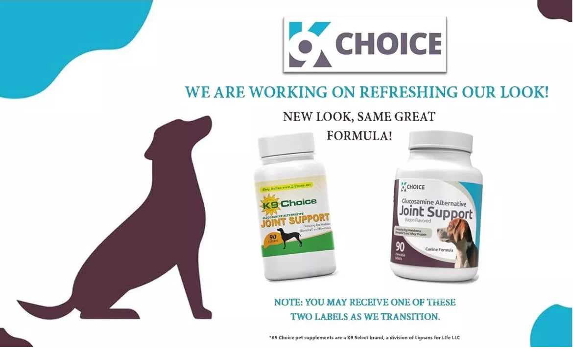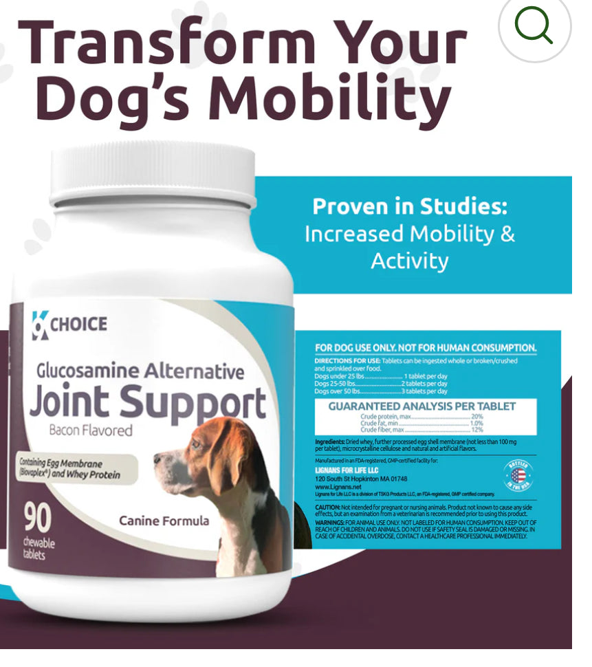 Made from Eggshell membrane. 90 tablets. These bacon flavored tablets can be ingested whole or cut/crushed and sprinkled over food. K9 Choice Joint Support provides the nutritional raw materials necessary to promote joint health, stability and flexibility, plus a healthier skin and coat.* It is a natural alternative to glucosamine and works faster than glucosamine. K9 Choice contains Biovaplex tm, which is made from whey protein and eggshell membrane. K9 Choice Joint Support improves range of motion, promotes a natural anti-inflammatory response, provides antioxidants to reduce free radicals, and provides collagen for a lustrous and healthy coat.* K9 Choice Joint Support features key elements Collagen, Elastin, Desmosine, Glycosaminoglycans, and Transforming Growth Factor. The Biova company developed a special, patent-pending process to remove the thin membrane inside the eggshell and compose it into a tablet, along with other beneficial ingredients. Egg membrane is very high in nutrients and transforming growth factor. Transforming growth factor is found in only 3 places in nature, egg membrane being one of them. It takes multiple eggs just to make one tablet of our K9 Joint Support. How much should I give my dog? For dogs under 25 lbs: give one tablet per day. For dogs 25-50 lbs: give 2 tablets per day. For dogs over 50 lbs: give 3 tablets per day. These chewable tablets can be given to dogs whole or broken/crushed and sprinkled on food. Testimonials "The product is working great and is flying off the shelves! My receptionist's German Shepherd couldn't walk and experienced pain even with the medications Nsaids and gabapentin. We added this supplement and the dog is doing great. Now off most of the pain meds." – Dr. Greg Reichenberger, DVM, West Wichita Animal Clinic. "I want to thank Lignans for Life for yet another great product from their site. I have a 13 year old male Weimaraner who has been a very active dog his whole life. Ever since last September, he started slowing down quite a bit. March 2014, the use of his back legs had become almost zero. He was falling every time he tried to get up and when he did finally get up, he would take a few steps, stop, and lay down right where he was. His whole attitude and quality of life had really gone downhill, to the point where my vet suggested we do an ultrasound to check for bleeding tumors of the spleen and spleen cancer. He started peeing where he slept and stopped making any attempts to get up all together. I spoke to Steve from Lignans for Life and asked for his advice and was led to their K9 Choice Joint Support. I was amazed to see the turn-around almost immediately. He started making more attempts to get up, began succeeding, and now he won’t even sit for a moment when he goes to the bathroom. The next vet visit, we learned that he had nothing wrong with his spleen and he got up and greeted every doctor that came to see him that day. Another product I am completely satisfied with and would 100% recommend to anyone who wants to see a change in their dog’s quality of life." –Alicia, Massachesetts "Hi Steve, this email is in regard to the K9 Choice Joint Support product that we have been purchasing from you. We have two Siberian huskies, Amber is our female and is 11 years old. She had an accident about two years ago and tore up her knee very badly. She needed a very expensive surgery. After the surgery, her recovery took a long time and the vet told us she needed glucosamine in order to complete the healing. We tried the glucosamine with asu and she became deathly sick. We then tried just glucosamine and she could not tolerate it. We went back to the vet and they prescribed Asian herbs. Again, she could not take them. At this point my wife and I became very troubled, so after much research, I came across your product K9 Choice. Let me tell you, everything is different. Amber takes the K9 Choice joint support with absolutely no problem and she runs around like a little puppy, jumping on and off the bed, which she could not do before. There is no sign that she ever had surgery. We are now giving our other Siberian, Cheyenne- who was beginning to get a little stiff in the joints- the K9 Choice joint support and he too has responded great: running, jumping and bouncing around. It is like a miracle to us. Thank you for this product; it is a great natural alternative. Full stars from me and my wife."-Mike P. Studies Results from a study involving 57 canines with limited joint mobility demonstrated positive results within 7 days of taking Biovaplex. 100% of subjects indicated increased activity and mobility by the conclusion of the 28 day study. Ingredients: Dried Whey, Further Processed eggshell meal (membrane only), microcrystalline cellulose, natural and artificial flavors Guranteed analysis: crude protein min 20%, crude fat min 1%, crude fiber max 12%