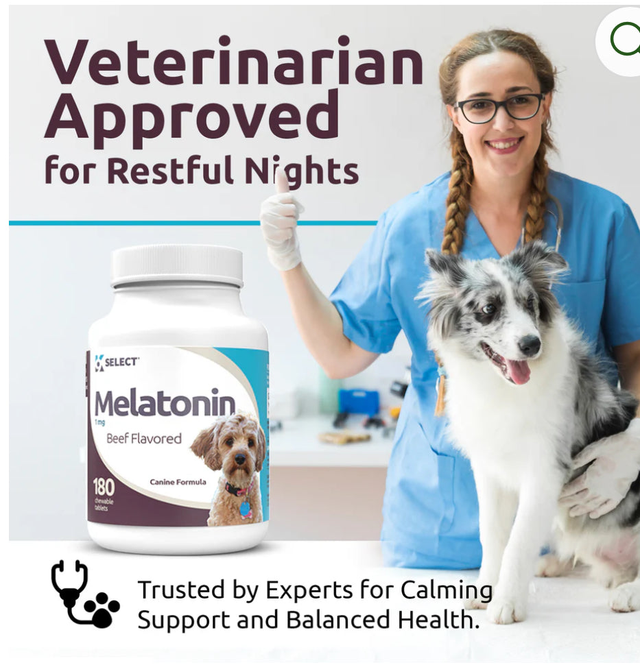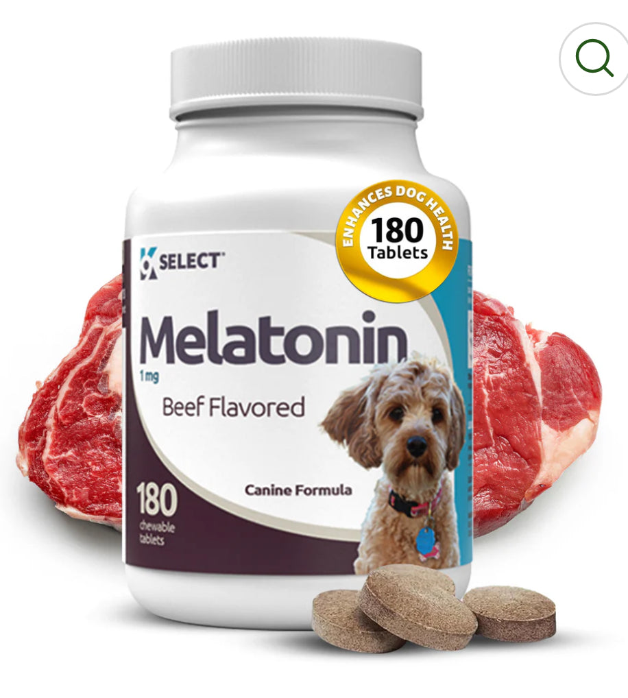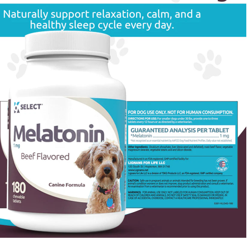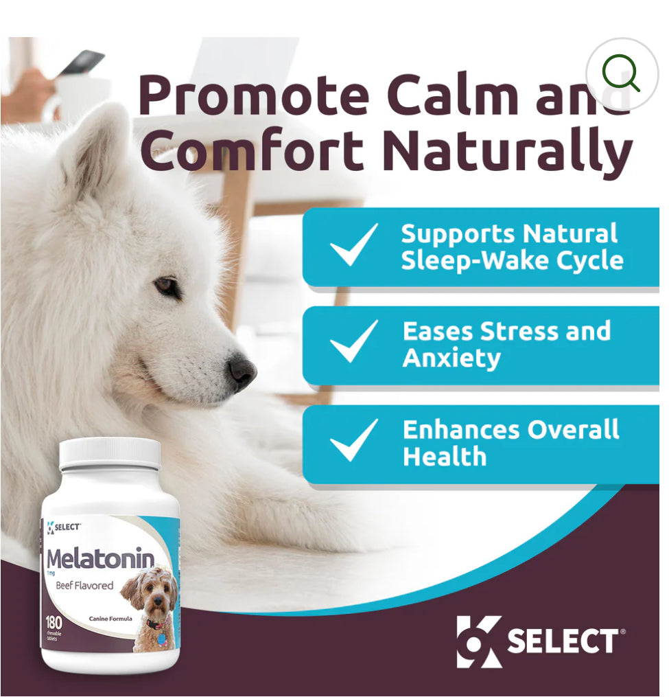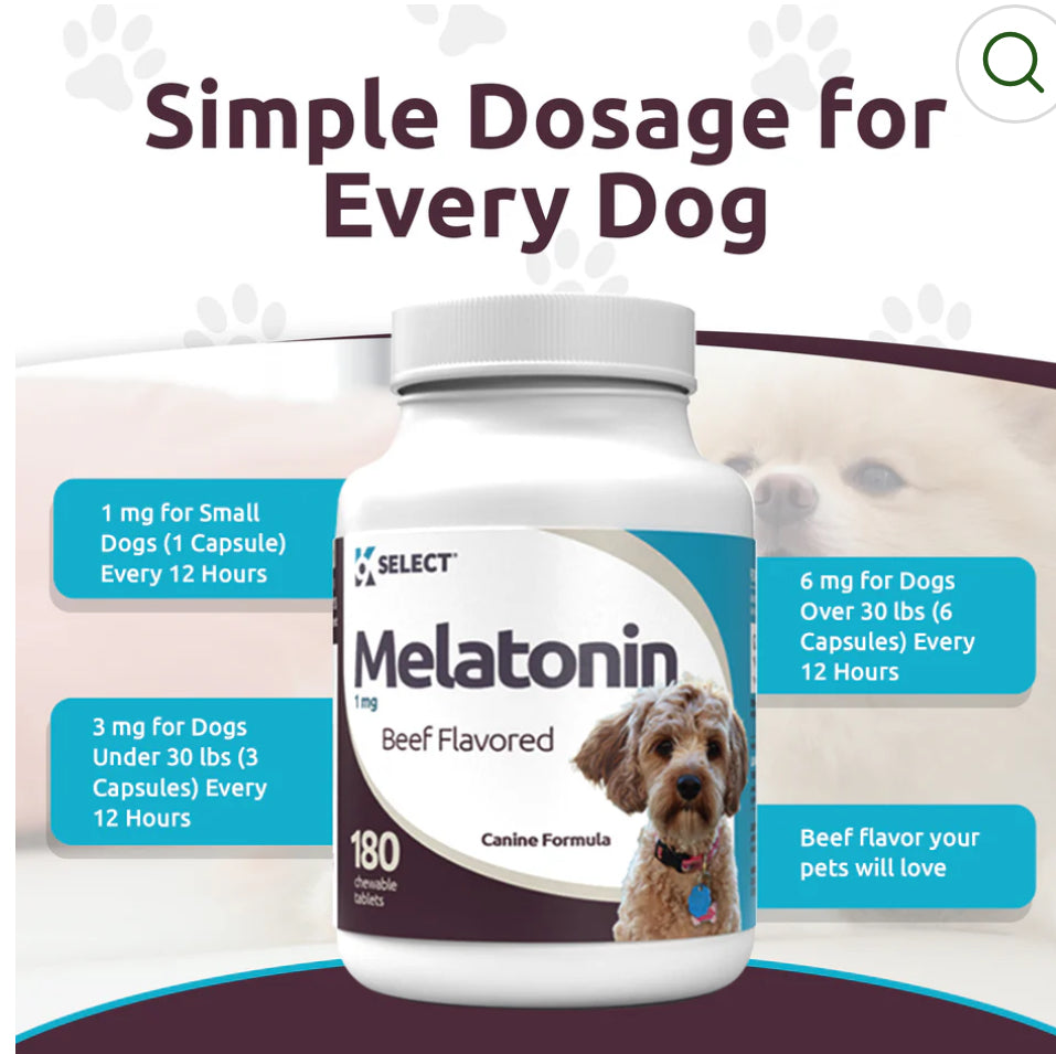 180 1 mg. servings. Now in a tasty beef liver-flavored 1 mg tablet! Our K9 Select brand melatonin supplements for dogs are tasty chewable tablets, carefully formulated to: