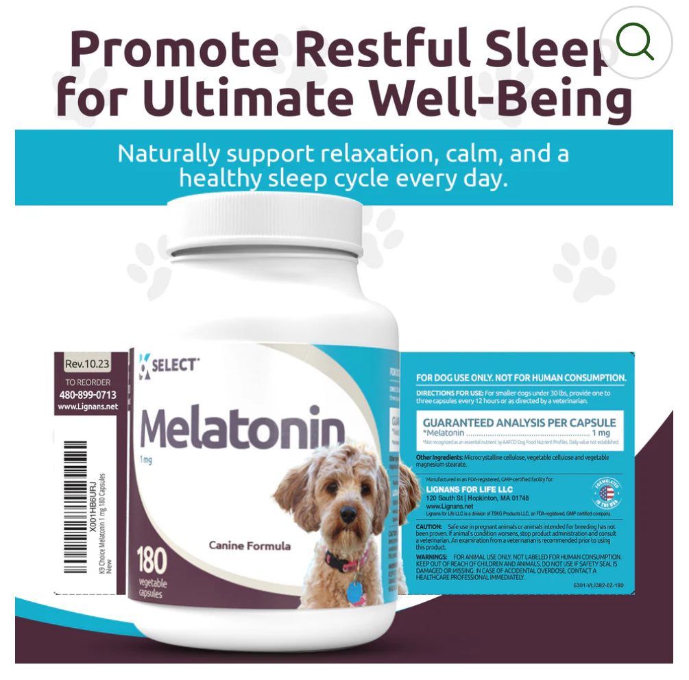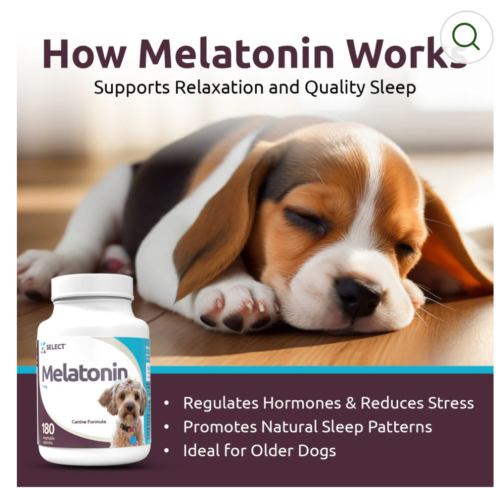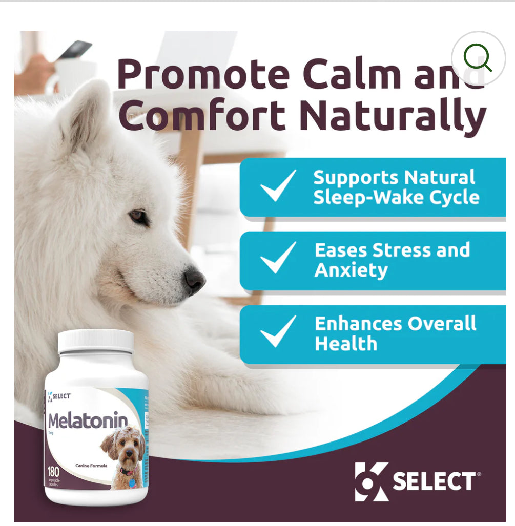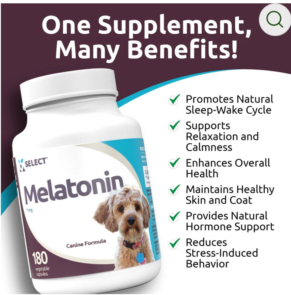 180 capsules, 180 1 mg. servings. Each bottle contains 180 capsules of 1 mg human-grade melatonin for dogs. Our K9 Select brand melatonin supplement for dogs is carefully formulated to:
