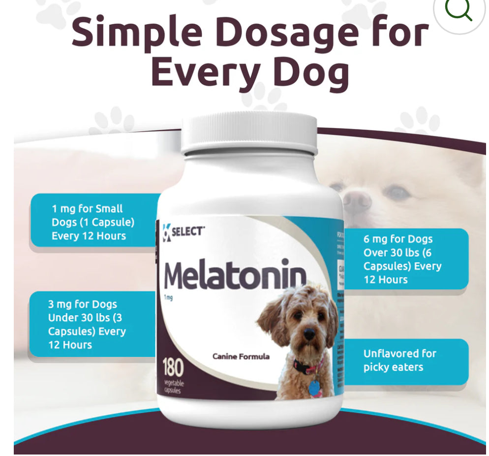- 3 mg of melatonin (3 capsules) every 12 hours for dogs under 30 lbs.