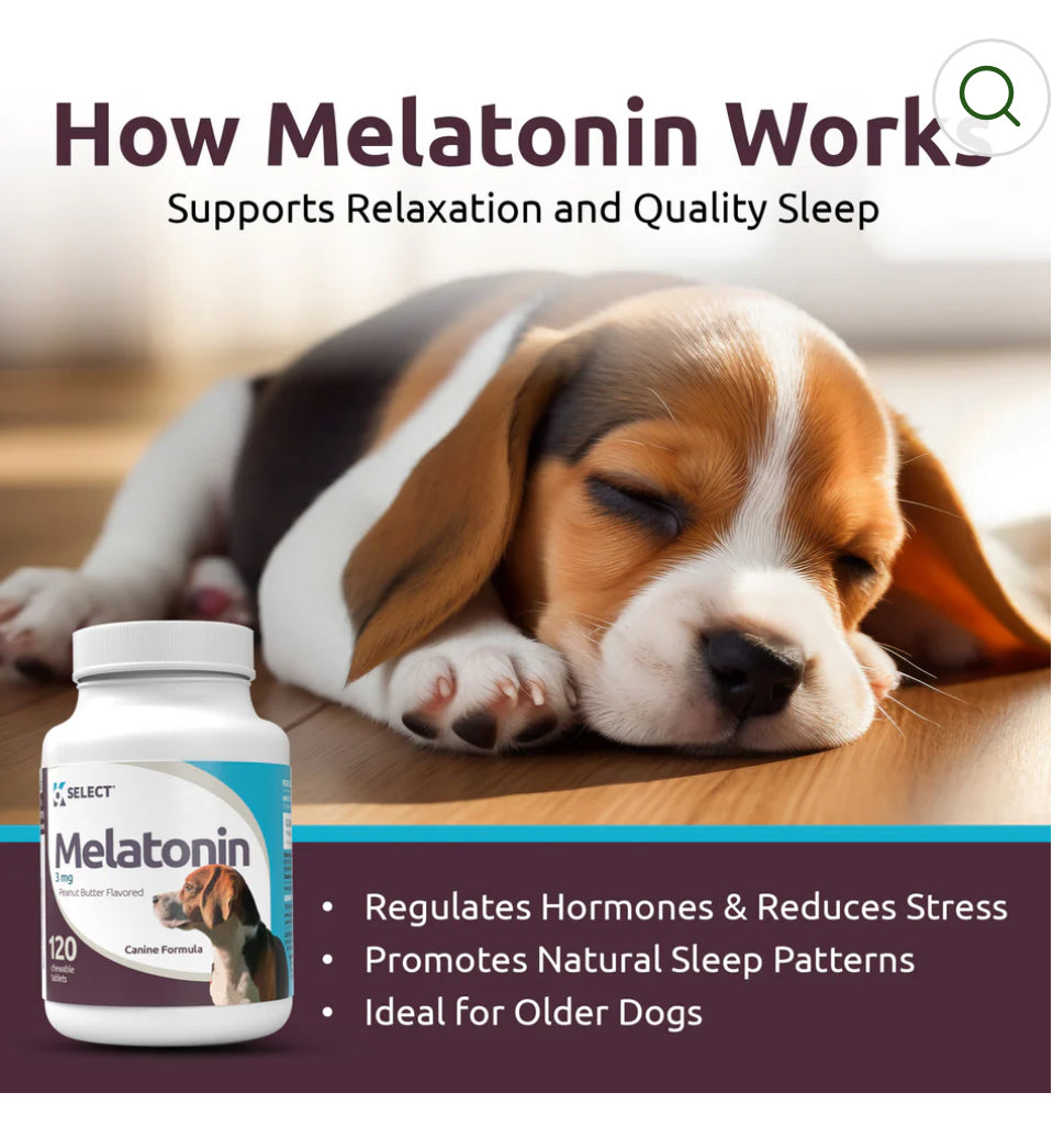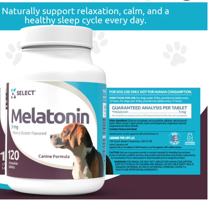 120 Chewable Tablets, 120 3 mg. servings. Each bottle contains 120 chewable tablets of 3 mg human-grade melatonin for dogs in a peanut butter flavor that dogs love! Our K9 Select brand melatonin supplements for dogs are carefully formulated to: