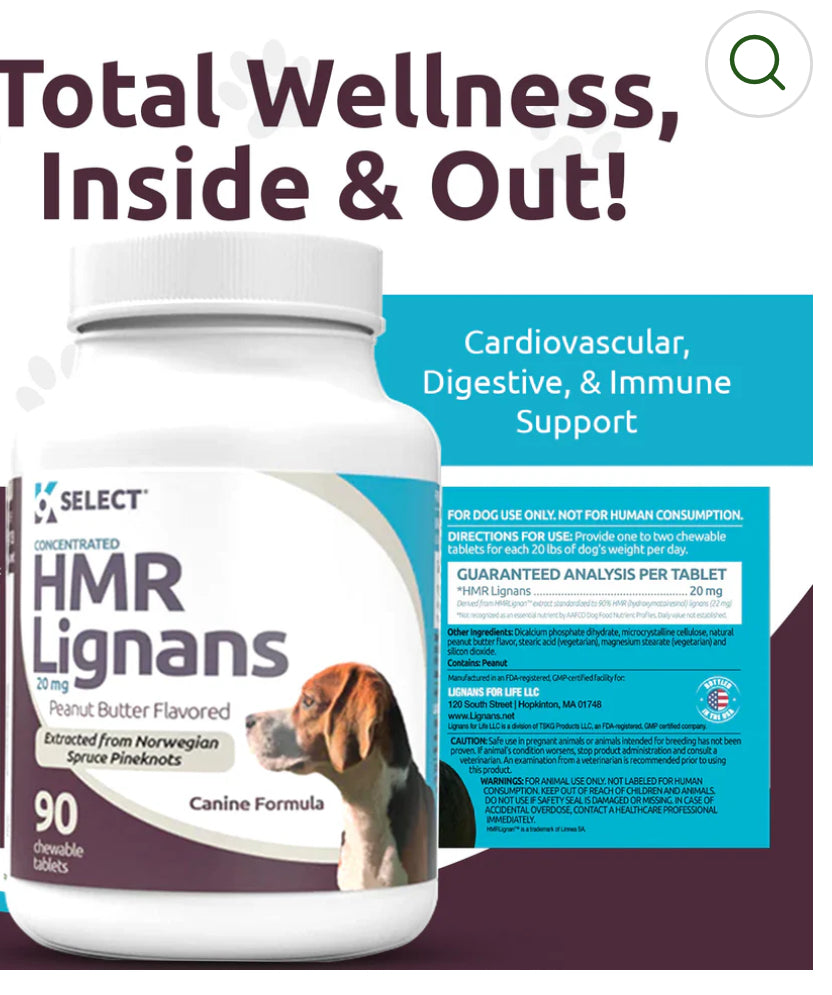 90 count bottle. 90 servings. We are proud to be the first to introduce a flavored lignan! Our K9 Select brand lignans are tasty peanut butter flavored tablets that your dog will love! Like our Lignans for Life HMR lignans, our K9 Select lignans are sourced from the same Norwegian spruce tree knots. HMR is short for hydroxymatairesinol, which is metabolized in the body into a powerful antioxidant that prevents or limits oxidative stress throughout the body and supports the immune system. Many studies indicate that high amounts of lignans in the body may reduce cortisol and other hormone levels and promote healthy reproductive organs. *